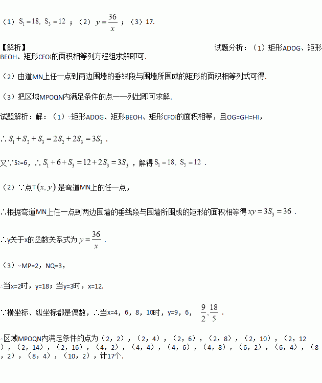 六•一儿童节,小文到公园游玩.看到公园的一段人行弯道MN(不计宽度),如图,它与两面互相垂直的围墙OP、OQ之间有一块空地MPOQN(MP⊥OP,NQ⊥OQ),他发现弯道MN上任一点到两边围墙的垂线段与围墙所围成的矩形的面积都相等,比如:A、B、C是弯道MN上的三点,矩形ADOG、矩形BEOH、矩形CFOI的面积相等.爱好数学的他建立了平面直角坐标系(如图),图中三块阴影部分的面积分别记为S1、S2、S3,并测得S2=6(单位:平方米).OG=GH=HI.
