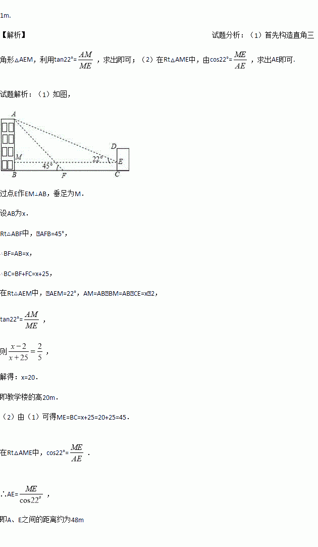 如图,某办公楼AB的后面有一建筑物CD,当光线与地面的夹角是22°时,办公楼在建筑物的墙上留下高3米的影子CE,而当光线与地面夹角是45°时,办公楼顶A在地面上的影子F与墙角C有27米的距离(B,F,C在一条直线上).