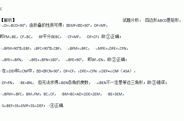 如图,在长方形ABCD中,点E是AD的中点,∠EBC的平分线交CD于点F,将△DEF沿EF折叠,点D恰好落在BE上M点处,延长BC、EF交于点N, 有下列四个结论:① DF=CF;② BF⊥EN;
