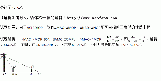 点 )20米的A点,沿OA所在的直线行走14米到B点时,身影的长度是变长了还是变短了?变长或变短了多少米?![]()