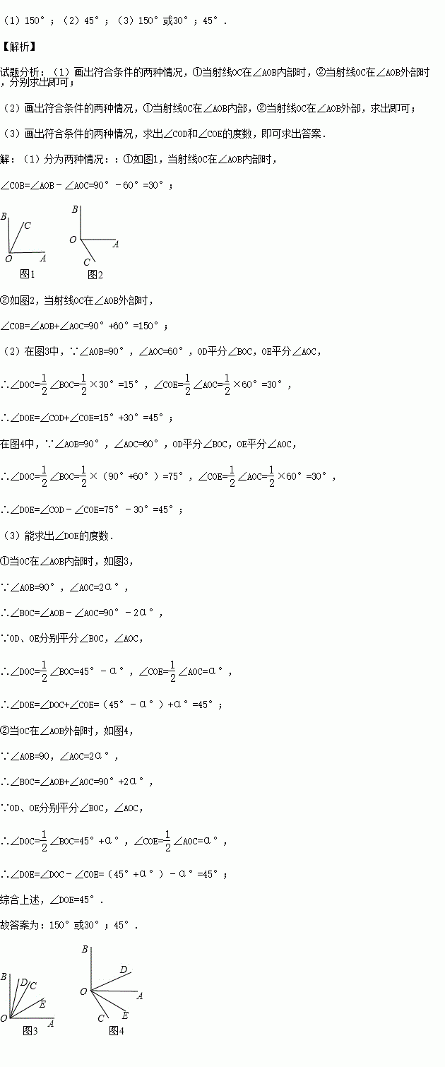 (3)试问在(2)的条件下,如果将题目中∠AOC=60゜改成∠AOC=2α(α<45゜),其他条件不变,你能求出∠DOE的度数吗?若能,请你写出求解过程;若不能,请说明理由.