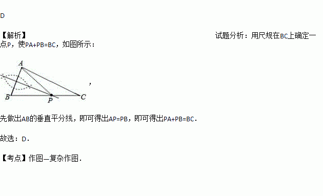 如下图,已知△ABC(AB<BC),用尺规在BC上确定一点P,使PA+PB=BC。则下面四种不同方法作图中准确的是( )