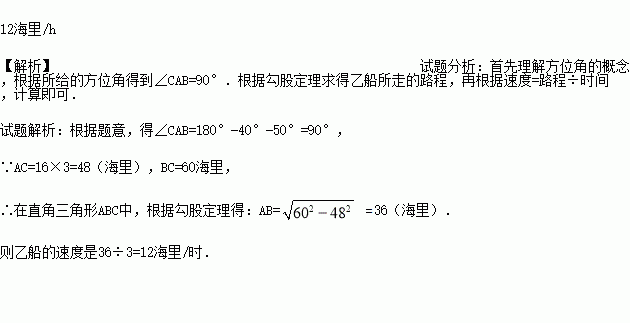 如图,甲乙两船从港口A同时出发,甲船以16海里/时速度向北偏东40°航行,乙船向南偏东50°航行,3小时后,甲船到达C岛,乙船到达B岛.若C、B两岛相距60海里,问乙船的航速是多少.