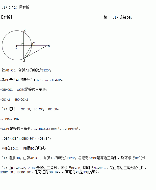 如图,已知P是⊙O外一点,PO交圆O于点C,OC=CP=2,弦AB⊥OC,劣弧AB的度数为120°,连接PB.
