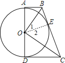 分析 连结OE,由切线的性质得OE⊥BC,再利用直角梯形的定义得到AD⊥AB,AD⊥CD,则可判断AB和CD都是⊙O的切线,根据切线长定理得到BA=BE,CE=CD,于是根据角平分线性质定理的逆定理得到OB平分∠AOE,OC平分∠DOE,则∠1+∠2=$\frac{1}{2}$(∠AOE+∠DOE)=90°,即∠BOC=90°,所以OB⊥OC.