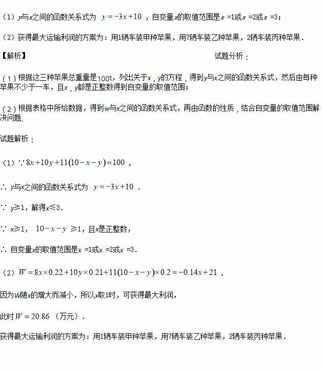 某运输公司用10辆相同的汽车将一批苹果运到外地,每辆汽车能装8吨甲种苹果,或10吨乙种苹果,或11吨丙种苹果.公司规定每辆车只能装同一种苹果,而且必须满载.已知公司运送了甲、乙、丙三种苹果共100吨,且每种苹果不少于一车.