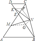 分析 取BE的中点E,CE的中点F,连结MG、NG、NF、KF,如图,先判断△ABE和△CDE都是等边三角形得到AB=BE,CD=CE,再根据三角形中位线性质得到MG=$\frac{1}{2}$AB,MG∥AB,FN=$\frac{1}{2}$BE,FN∥BE,NG=$\frac{1}{2}$CE,NG∥CE,KF=$\frac{1}{2}$CD,KF∥CD,则MG=NF,NG=KF,根据平行线的性质得∠NGE=∠GEM=∠EFN,易得∠MGN=∠NFK,则根据“SAS”可判断△GMN≌△FNK,所以MN=NK.