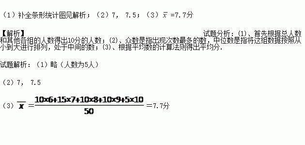 某校组织开展校园诗词大会,参赛学生均作答10题,每答对一题得1分.随机抽取的九年级50名学生答题分数的情况有如下所示的不完整的条形统计图.