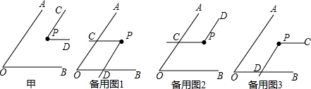 (1)以P为顶点,作∠CPD,使∠CPD的两边与∠AOB的两边分别平行,请在下列备用图中尽可能多地作出符合条件的∠CPD.