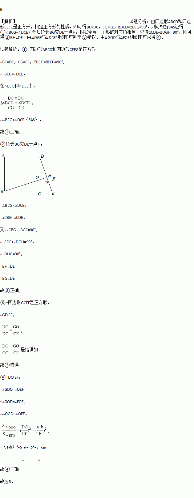 如图,四边形ABCD、CEFG都是正方形,点G在线段CD上,连接BG、DE,,DE和FG相交于点O.设AB=a,CG=b(a>b).下列结论:①ΔBCG?ΔDCE;②BG⊥DE;③