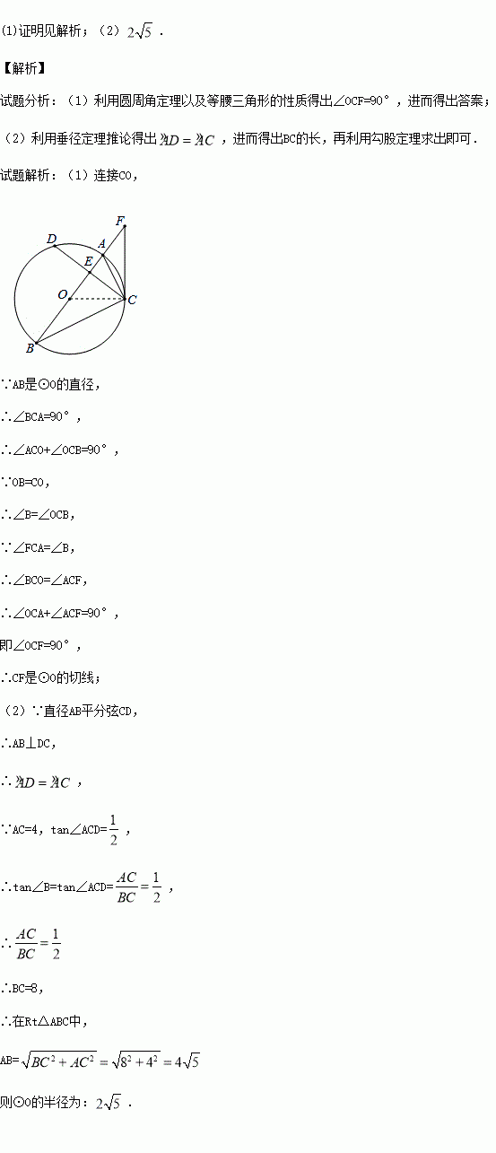 如图,在⊙O中,直径AB平分弦CD,AB与CD相交于点E,连接AC、BC,点F是BA延长线上的一点,且∠FCA=∠B.