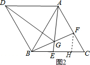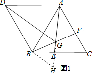 (2)延长GE至点H,使GH=GB,由于∠BGE=60°,根据等边三角形的判定得到△BGH为等边三角形,然后根据等边三角形的性质得到BG=BH=GH,∠GBH=60°,且AB=BD,∠ABD=60°,易得∠ABH=∠DBG,根据三角形全等的判定方法可证得△DBG≌△ABH(SAS),则DG=AH,即可得到DG=AG+BG;