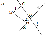 分析:根据对顶角相等得到∠3=∠ABC,则∠ABC+∠DCB=180°,可判定DC∥AB,则∠2=∠4,利用∠1=∠2,得到∠1=∠4,根据平行线的判定得CM∥EG,然后根据两直线平行,同旁内角互补得∠CME+∠GEM=180°,