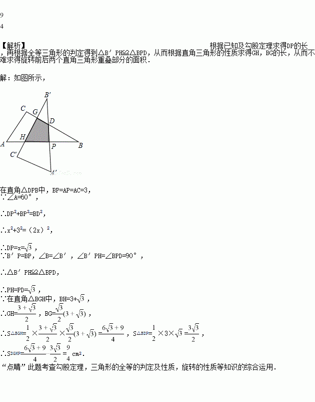 如图,在Rt△ABC中,已知∠C=90°,∠A=60°,AC=3cm,以斜边AB的中点P为旋转中心,把这个三角形按逆时针方向旋转90°得到Rt△A′B′C′,则旋转前后两个直角三角形重叠部分的面积为______.