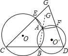 已知:⊙O和⊙O′交于A、B两点,过点B的直线分别交⊙O和⊙O′于点C、D、G是两圆外一点,GC、GD分别交⊙O和⊙O′于点E、F,求证:∠EAF=∠C+∠D.
