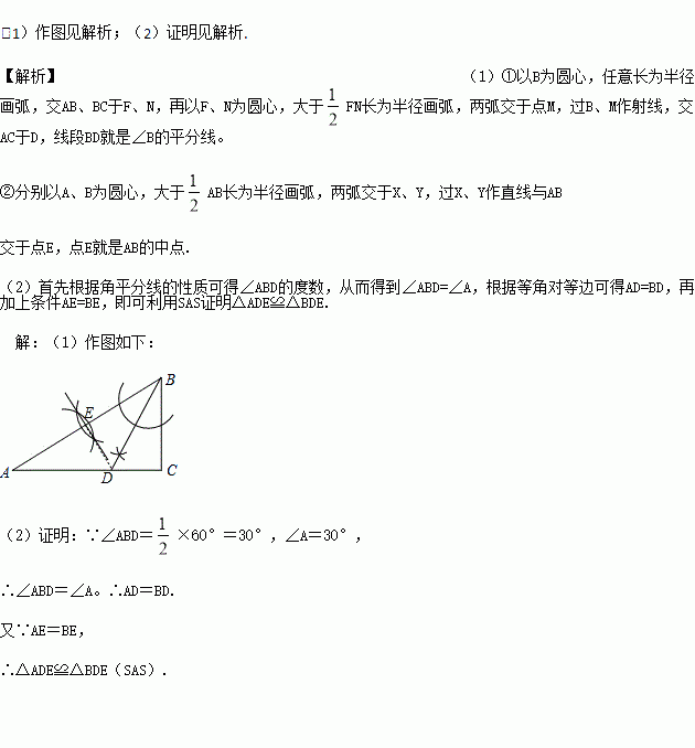 (1)作∠B的平分线BD,交AC于点D;作AB的中点E(要求:尺规作图,保留作图痕迹)