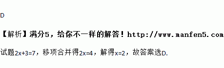 科目:初中数学 来源:人教版初中数学七年级上第三章3.2 解一元一次方程(移项与合并同类项)同步练习 题型:单选题