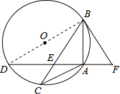 分析 (1)连结BD,如图,由AD⊥AB,根据圆周角定理的推理可得BD为⊙O的直径,再根据切线的性质得∠DBA+∠ABF=90°,则利用等角的余角相等得∠D=∠ABF,根据圆周角定理有∠D=∠C,已知条件有∠ABF=∠ABC.所以∠C=∠ABC,于是根据等腰三角形的判定定理即可得到AB=AC;