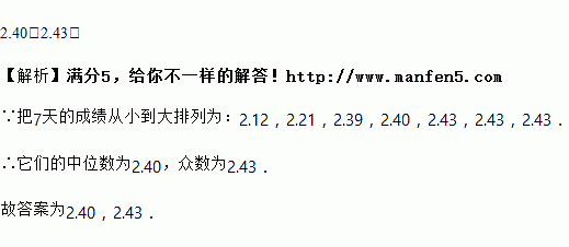 为参加2018年“宜宾市初中毕业生升学体育考试”,小聪同学每天进行立定跳远练习,并记录下其中7天的最好成绩(单位:m)分别为:2.21,2.12,2.43,2.39,2.43,2.40,2.43.这组数据的中位数和众数分别是_____.