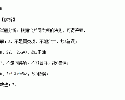 A.2a+3b=5ab B.2ab﹣2ba=0 C.2a2b﹣ab2=a2b D.2a2+3a2=5a3