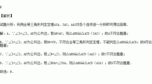 (2011•宿迁)如图,已知∠1=∠2,则不一定能使△ABD≌△ACD的条件是( )