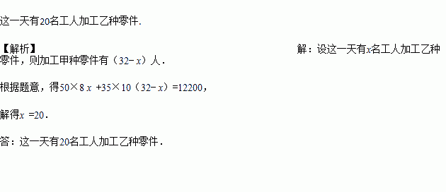 某车间有32名工人,每人每天可加工甲种零件10个或乙种零件8个。在这32名工人中,一部分工人加工甲种零件,其余的加工乙种零件,已知每加工一个甲种零件可获利35元,每加工一个乙种零件可获利50元。若此车间这一天一共获利12200元,求这一天加工乙种零件工人的人数。