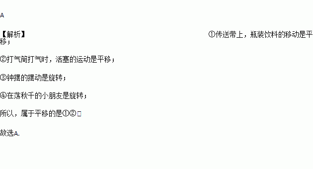 以下现象:①传送带上,瓶装饮料的移动;②打气筒打气时,活塞的运动;③钟摆的摆动;④在荡秋千的小朋友.其中属于平移的是( )