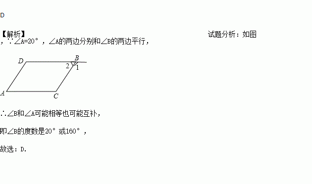 已知∠A的两边与∠B的两边互相平行,且∠A=20°,则∠B的度数为( ).
