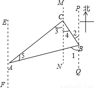 解答:解:如图.由题意可知,AB=5km,∠2=30°,∠EAB=60°,∠3=30°.