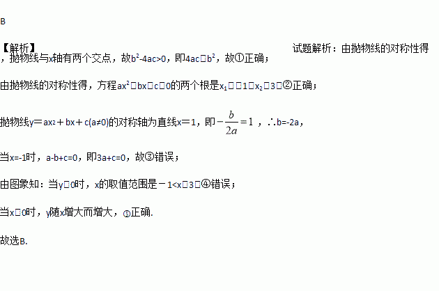 如图,抛物线y=ax2+bx+c(a≠0)的对称轴为直线x=1,与x轴的一个交点坐标为(-1,0),其部分图象如图所示,下列结论:①4ac<b2;②方程ax2+bx+c=0的两个根是x1=-1,x2=3;③3a+c>0;④当y>0时,x的取值范围是-1≤x<3;⑤当x<0时,y随x增大而增大.其中结论正确的个数是( )