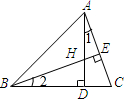 分析 首先根据DA和BE是高,可得∠ADB=∠BEC=90°,然后可得∠1+∠C=90°,∠2+∠C=90°,根据同角的余角相等可得∠1=∠2,然后可判定△BHD≌△ACD.