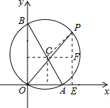 分析:由OA与OB的长,利用勾股定理求出AB的长,根据∠AOP=45°,得到三角形OPE为等腰直角三角形,即P横纵坐标相等,设为P(a,a),由∠AOB为直角,利用直角所对的弦为直径得到AB为直径,Rt△AOB外接圆的圆心为AB中点,求出圆心C坐标,过点C作CF∥OA,过点P作PE⊥OA于E交CF于F,在直角三角形PCF中,利用勾股定理列出关于a的方程,求出方程的解得到a的值,确定出P的坐标即可.