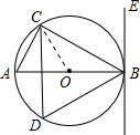 分析:(1)由同弧所对的圆周角相等得到∠A=∠D,由∠D度数求出∠A度数,再由AB为直径,利用直径所对的圆周角为直角得到∠ACB为直角,进而求出∠ABC的度数,由∠EBC+∠ABC为90度,确定出EB垂直于AB,即可得证;