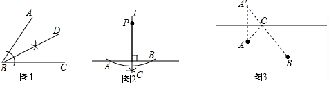 分析 (1)直接利用角平分线的作法得出符合题意的图形;(2)利用过直线外一点作已知直线的垂线作法得出答案;(3)利用轴对称求最短路线的方法得出答案.