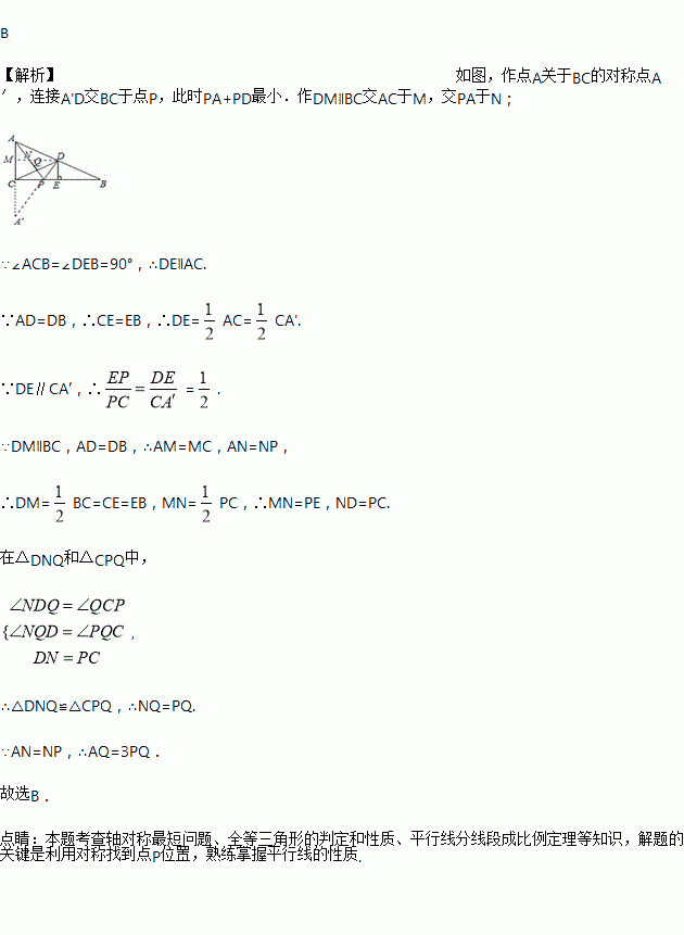 如图,在Rt△ABC中,∠ACB=90°,点D是AB边的中点,过D作DE⊥BC于点E,点P是边BC上的一个动点,AP与CD相交于点Q.当AP+PD的值最小时,AQ与PQ之间的数量关系是( )