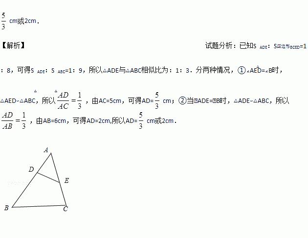 在△ABC中,AB=6cm,AC=5cm,点D、E分别在AB、AC上.若△ADE与ABC相似,且S△ADE:S四边形BCED =1:8,则AD为_________________.