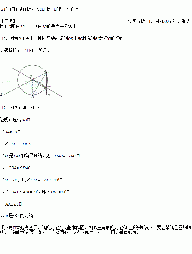 (1)以AB上的一点O为圆心,AD为弦在图中作出⊙O.(不写作法,保留作图痕迹);