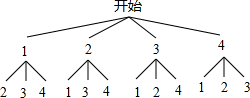 ∵共有等可能的结果12种:(x,y)为(1,2)、(1,3)、(1,4)、(2,1)、(2,3)、(2,4)、(3,1)、(3,2)、(3,4)、(4,1)、(4,2)、(4,3);其中(x,y)所表示的点在函数y=-x+5的图象上的有4种,