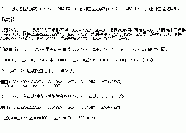 (3)如图2,若点P、Q在运动到终点后继续在射线AB、BC上运动,直线AQ、CP交点为M,则∠QMC变化吗?若变化,请说明理由;若不变,则求出它的度数.