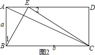(2)点E在线段AD上的任一点,且不与A、D重合,当△ABE与△BCE相似时,则∠BEC=90°当△BAE∽△CEB(如图2),∠1=∠BCE,又BC∥AD,由平行线的性质得到∠2=∠BCE,推出△BAE∽△EDC,得到比例式$\frac{x}{a}=\frac{a}{b-x}$,得到一元二次方程x2-bx+a2=0,根据方程根的情况,得到结论.