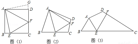 小聪把△ABE绕点A逆时针旋转90°至△ADG,从而发现EF=BE+FD,请你利用图(1)证明上述结论.