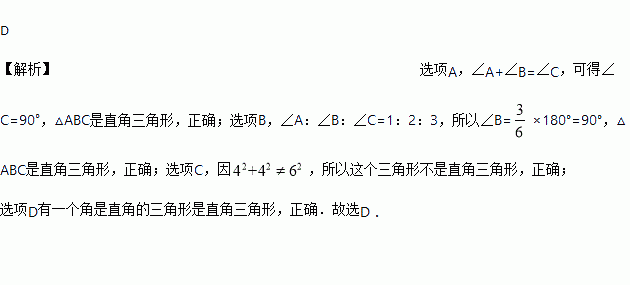 ①如果∠A+∠B=∠C,那△ABC是直角三角形;②如果∠A:∠B:∠C=1:2:3,则三角形是直角三角形;③如果三角形的三边长分别是4、4、6,那么这个三角形不是直角三角形;④有一个角是直角的三角形是直角三角形