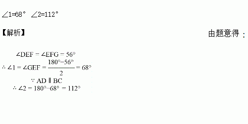 把一张长方形纸片ABCD沿EF折叠后ED与BC的交点为G,D,C分别在M,N的位置上,若∠EFG=56°,则∠1=_______,∠2=______.
