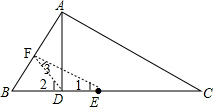 分析 首先取AB中点F,连接FD,EF,判断出EF∥AC,即可判断出∠1=∠C,再根据∠B=2∠C,可得∠B=2∠1;然后根据AD⊥BC,AF=BF,判断出FD=BF=$\frac{1}{2}$AB;最后判断出∠1=∠3,即可判断出DF=DE,所以AB=2DE,据此解答即可.
