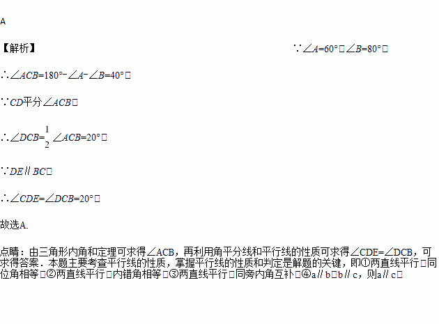 如图,CD是△ABC的角平分线,DE∥BC.若∠A=60°,∠B=80°,则∠CDE的度数是( )