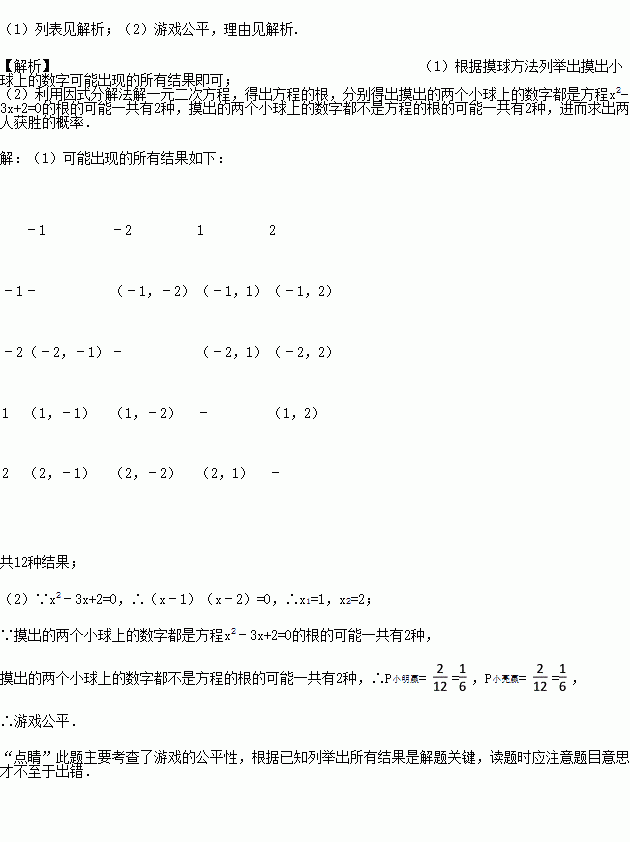 (2)若规定:如果摸出的两个小球上的数字都是方程x2-3x+2=0的根,则小明赢.如果摸出的两个小球上的数字都不是方程x2-3x+2=0的根,则小亮赢.你认为这个游戏规则对小明、小亮双方公平吗?请说明理由.