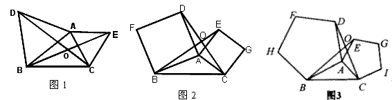 (1)如图1,图2,图3,在△ABC中,分别以AB、AC为边,向△ABC 外作正三角形,正四边形,正五边形,BE、CD相交于点O。