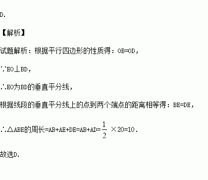 如图,在周长为20cm的□ABCD中,AB≠AD,对角线AC、BD相交于点O,OE⊥BD交AD于E,则△ABE的周长为( )