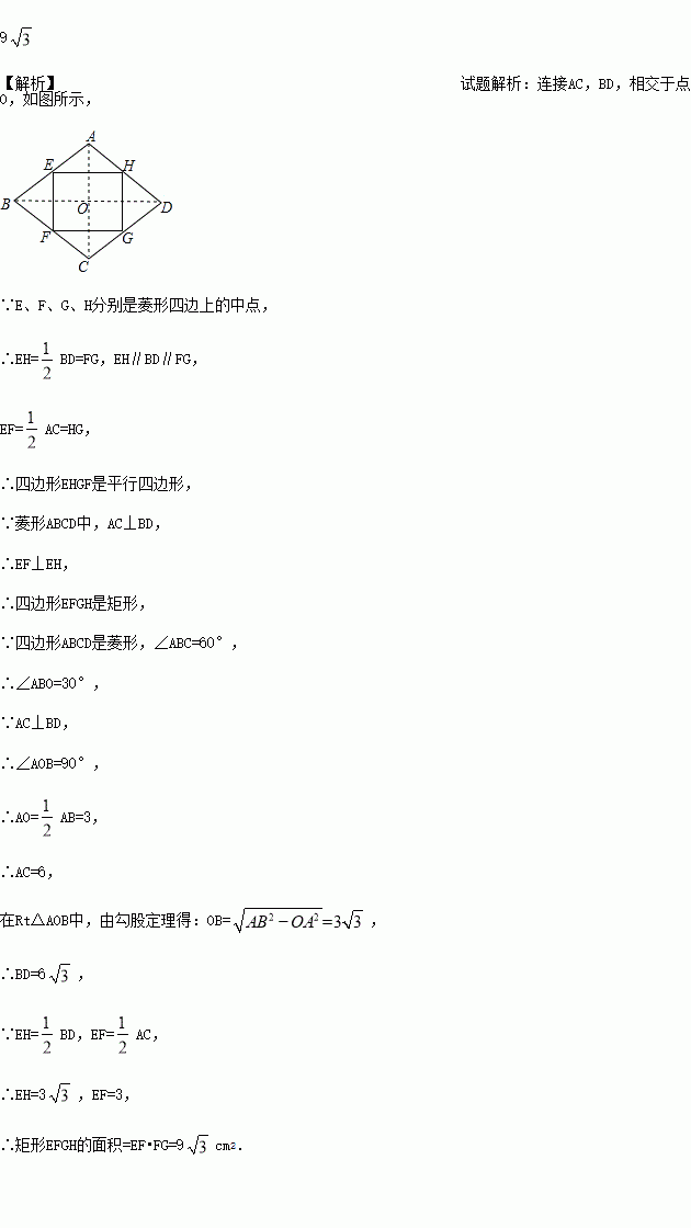 如图,已知E、F、G、H分别为菱形ABCD四边的中点,AB=6cm,∠ABC=60°,则四边形EFGH的面积为 ___________ cm