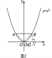 分析 (1)①①过点B作BN⊥x轴于N,根据△AMB为等腰直角三角形,AB∥x轴,所以∠BMN=∠ABM=45°,所以∠BMN=∠MBN,得到MN=BN,设B点坐标为(n,n),代入抛物线y=x2,得n=n2,解得n=1,n=0(舍去),所以B(1,1),求出BM的长度,利用勾股定理,即可解答;